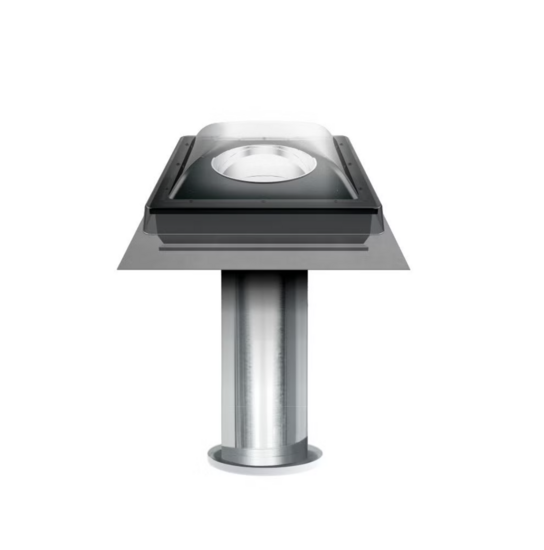 Lichttunnel, bolvormige glasplaat, vaste buis en plafondarmatuur met lichtverdeler, v.v. één laag gehard glas met geïntegreerde gootstukken voor platdak
